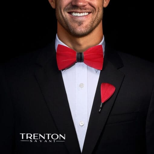 The Crimson Charisma Red Feather Bowtie and Pin Ensemble