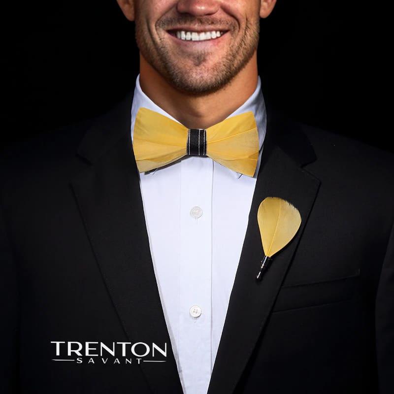 The Golden Flair: Canary Yellow Feather Bow Tie & Pin – A Symphony of Elegance and Confidence
